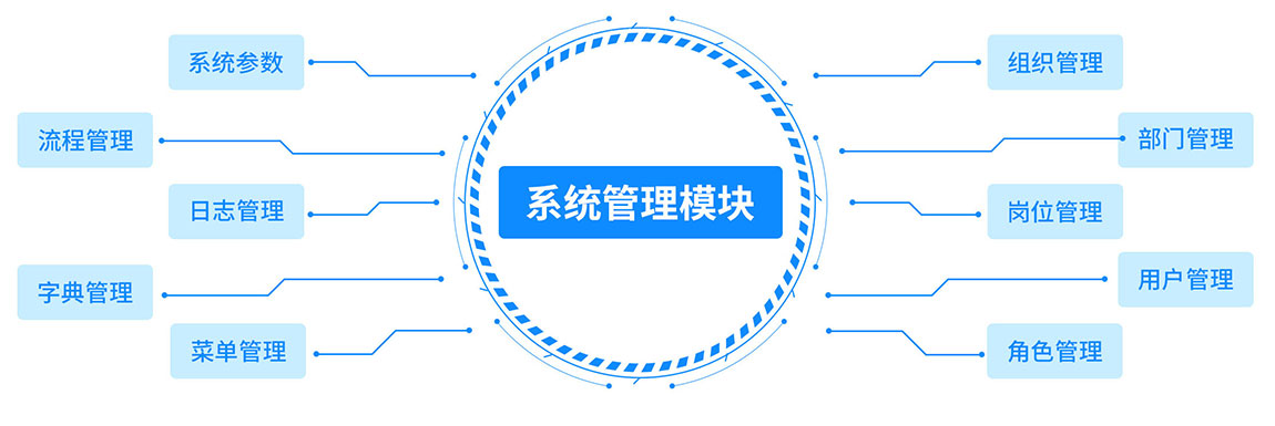 系統(tǒng)管理模塊提供各項基礎參數(shù)配置,用于支撐系統(tǒng)人員層級的管理和人員權(quán)限的控制以及離散屬性的配置如各項閥值等。包含組織管理、部門管理、崗位管理、角色管理、用戶管理、菜單管理、字典管理、日志管理、系統(tǒng)參數(shù)、流程管理。